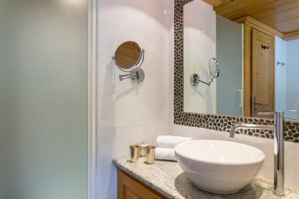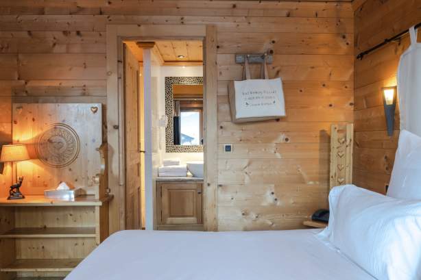 Facing the Mont-Blanc, enjoy this bedroom with classic wood design. It has a private bathroom with shower and a unique view on the Mountains of Chamonix Valley.